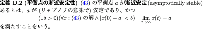 (私が学生で、このあたりのことを勉強したとき、「リャプノフの意味で」 というのを見て、「そうでない意味で安定というのは、例えばどういうの?」 と気になった。 でもそういうのを目にすることはなく、 最近は「リャプノフの意味で」というのは省略されるのが多くなった。 時間が経って、言葉が定着したということなのだろう。)